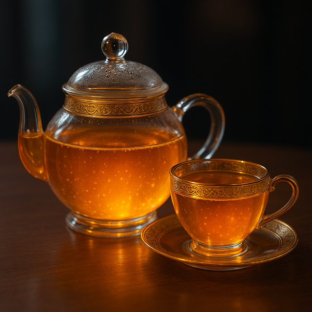 ……光果の皮を乾かして煮出した琥珀色の茶。微光がカップの縁に残ります。