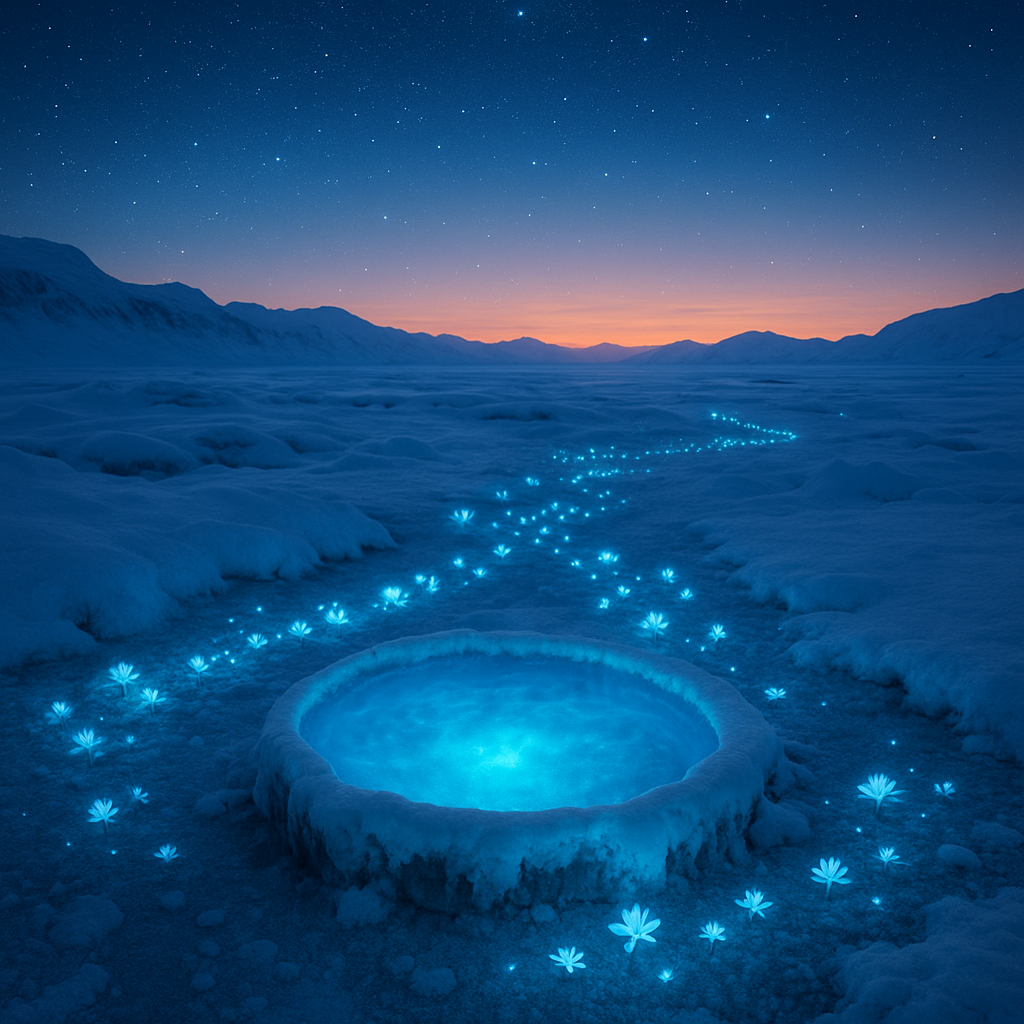 ……氷原の下から湧く“蒼熱泉”が、旅人に人気の休憩地。